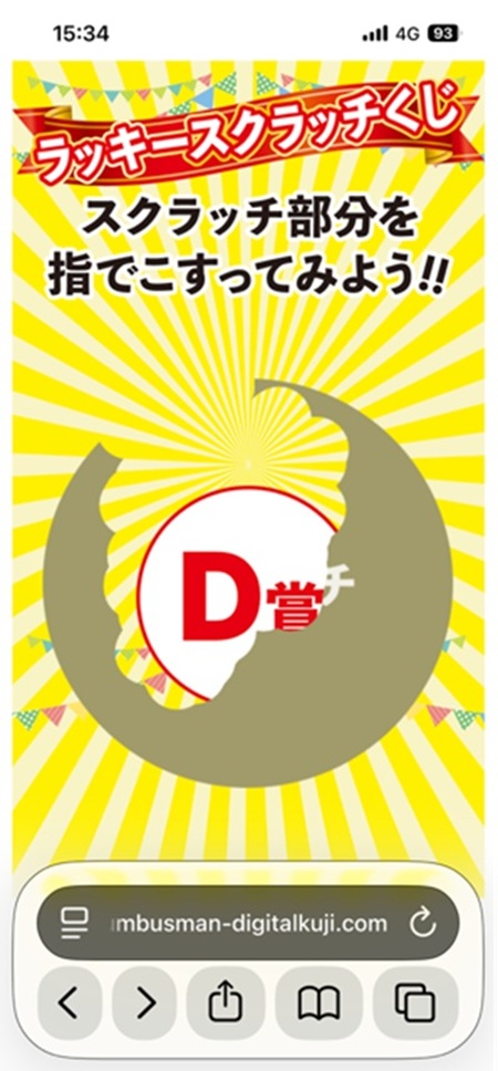 ◆ 1月に自由が丘でお買い物をした際、お店の人が渡してくれたクジ引き券(1回分)。 お昼休みにくじ会場に行ってみた。 アルバイトのお兄さんが差し出したQRコードをスマホで読み取る方式。 画面に出てきたのはスクラッチくじ。 普通ならコインや爪などでこすって確認するのですが・・・。 今どきのスクラッチは、画面を指でこすると下に当たりくじが出てくる仕組み!? やってみた時は、へぇ~面白い! と思った反面、「くじ引き」もとうとうここまで来たか・・・と思った次第。 結果は!? 当然ハズレ~<苦笑>。